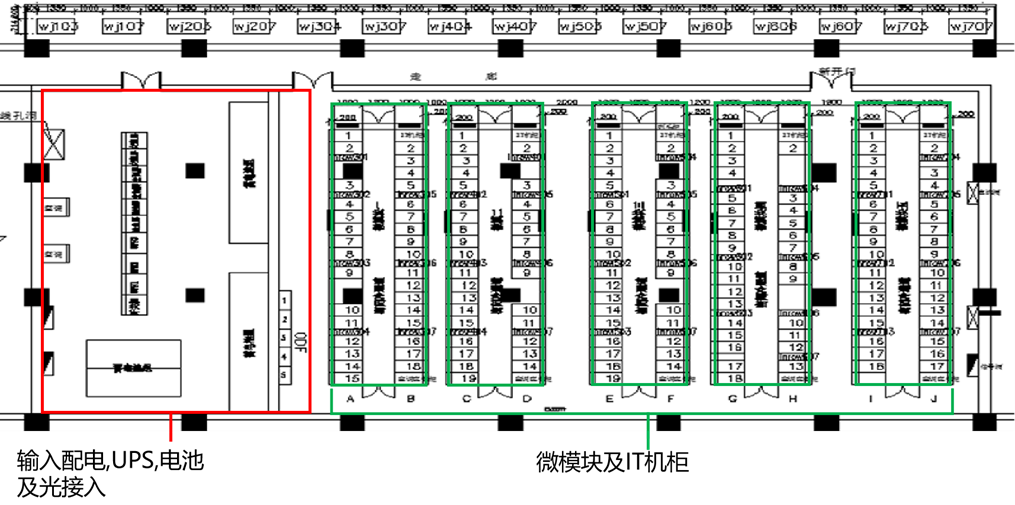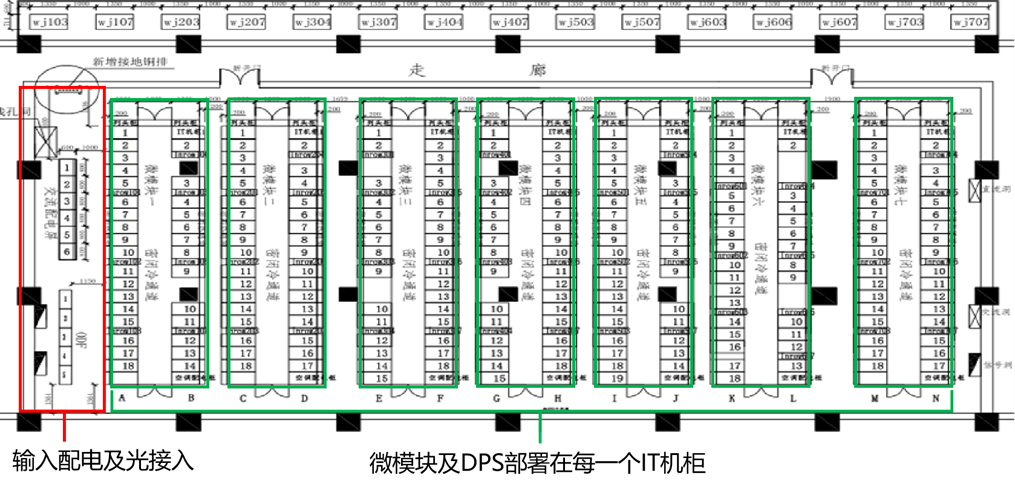 机房采用一路DPS供电,一路市电供电方式,单机架设计功耗6kVA,配置232台DPS(内置锂电池),每一层楼共可以部署232架IT机柜。