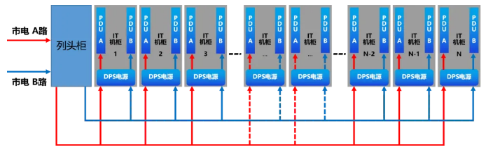 采用一路市电+一路DPS供电方式,满足GB50174-2017 《数据中心设计规范》A级机房中对于不间断电源系统配置的一路UPS+一路市电要求。